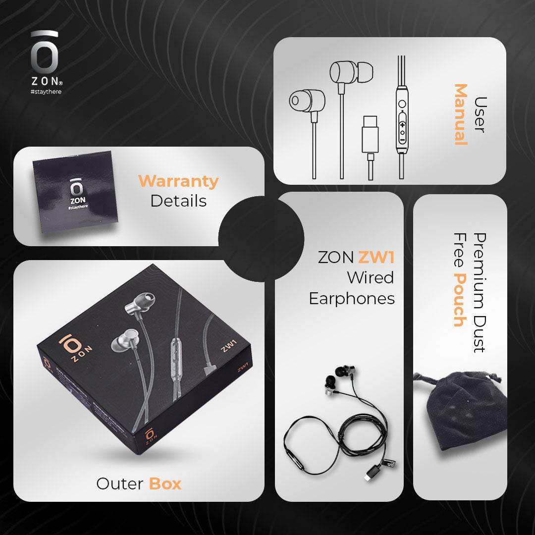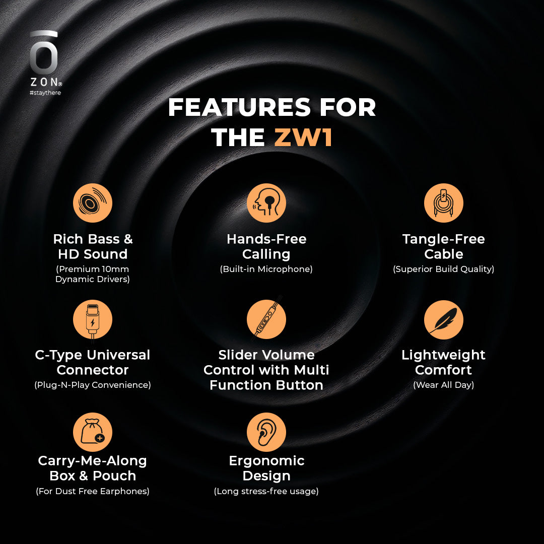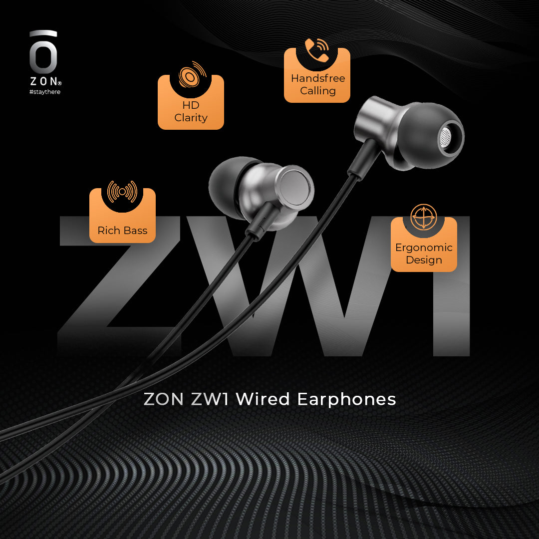 Get into your zone with ZON rich bass, clear sound ZW1 in-ear earphones. Stay in your ZON all day with your music and enjoy HD movies with more life-like sound quality. Communicate seamlessly with the inbuilt mic that has high sensitivity and a versatile frequency range to provide the ultimate experience;